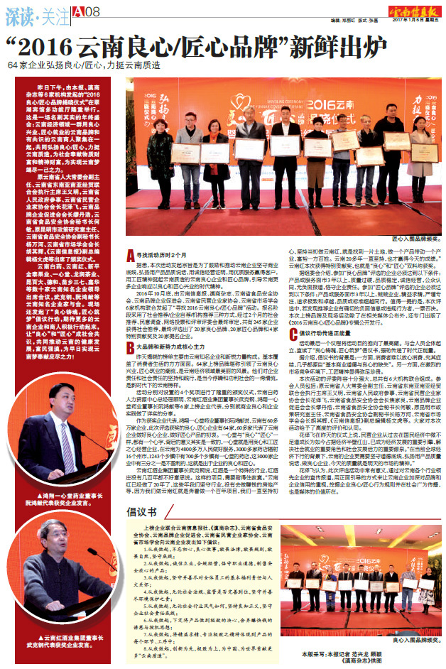 昨日下午,由云南信息報(bào)、滇商雜志、云南省民營企業(yè)家協(xié)會(huì)、云南省食品協(xié)會(huì)等6家機(jī)構(gòu)發(fā)起的“2016良心/匠心品牌揭曉儀式”在翠湖賓館多功能廳隆重舉行。這是一場名副其實(shí)的年終盛會(huì):云南經(jīng)濟(jì)領(lǐng)域一群用良心興業(yè)、匠心筑業(yè)的云南品牌和有共識(shí)的云南商人聚集在一起,共同弘揚(yáng)良心/匠心,力挺云南質(zhì)造,為社會(huì)奉獻(xiàn)物質(zhì)財(cái)富和精神財(cái)富,為實(shí)現(xiàn)云南夢竭盡一己之力。