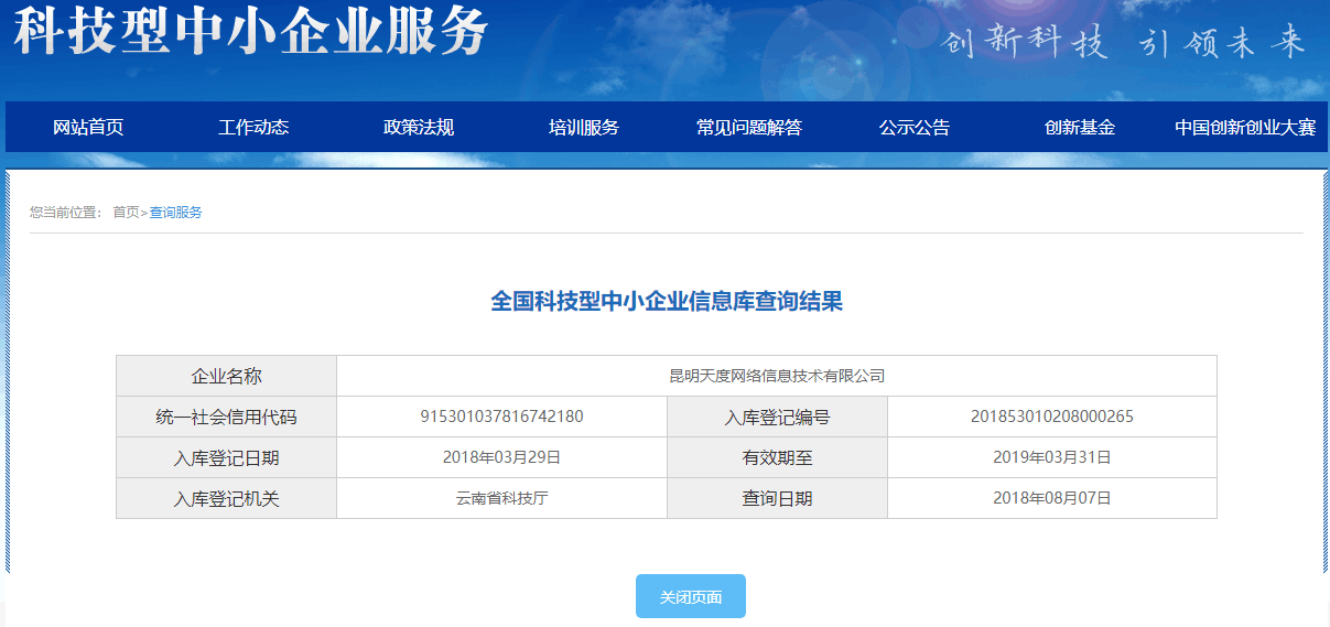 經(jīng)科技部門審核,確定天度符合科技型中小企業(yè)要求,3月29日,昆明天度網(wǎng)絡(luò)信息技術(shù)有限公司成功入庫登記成為2018年“全國科技型中小企業(yè)”!