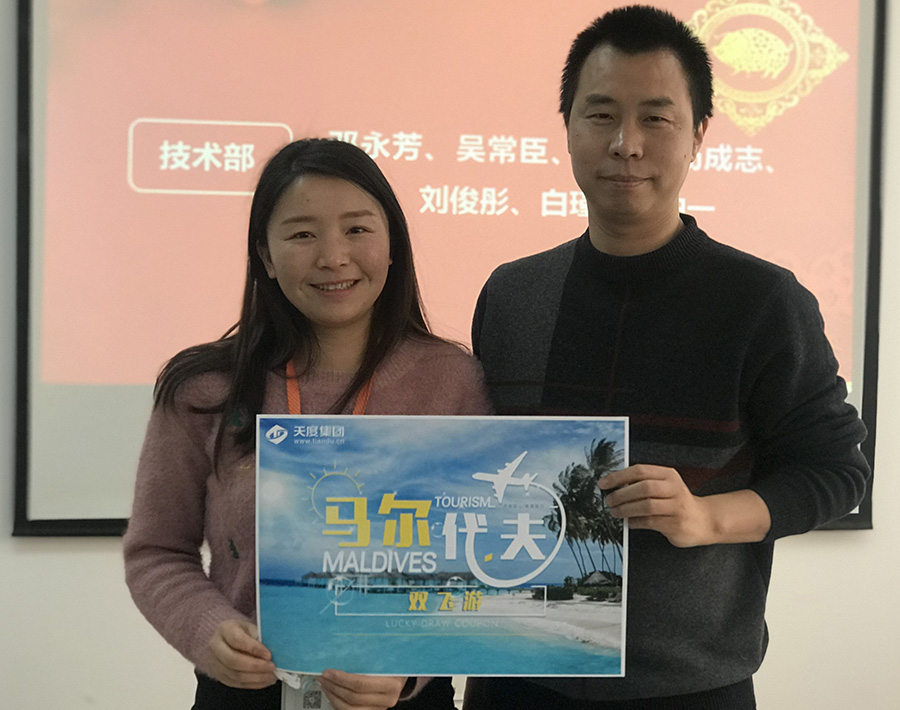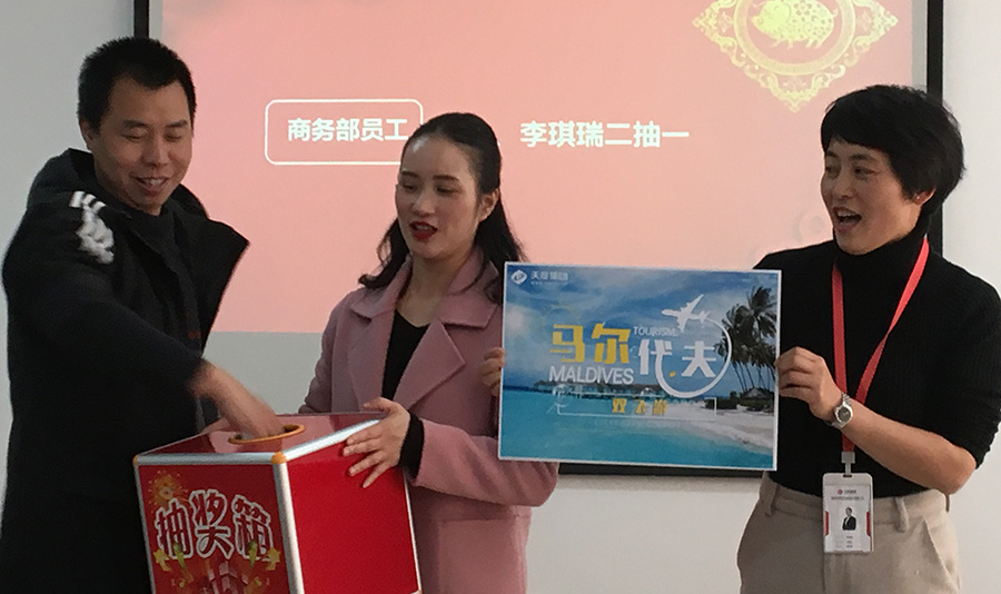 天度網(wǎng)絡(luò)公司今年拿出數(shù)十萬(wàn)現(xiàn)金紅包,由楊總和陸總進(jìn)行發(fā)放(集團(tuán)每個(gè)公司的獎(jiǎng)勵(lì)和獎(jiǎng)金發(fā)放都是單獨(dú)進(jìn)行,據(jù)悉,集團(tuán)今年不管是獎(jiǎng)金總額、還是獎(jiǎng)金單額都超過(guò)往年,總額超過(guò)7位數(shù))。公司對(duì)2018年度各部門優(yōu)秀同事進(jìn)行了表彰,并發(fā)對(duì)各個(gè)獎(jiǎng)項(xiàng)進(jìn)行發(fā)放,同時(shí)鄭董事長(zhǎng)現(xiàn)場(chǎng)抽取了“馬爾代夫帶薪休假旅游”的名額。