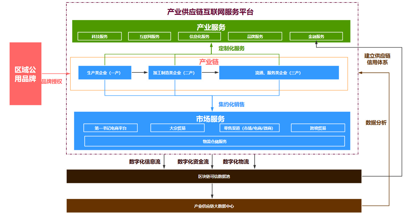數(shù)字化供應(yīng)鏈服務(wù)平臺應(yīng)立足區(qū)域傳統(tǒng)產(chǎn)業(yè)、優(yōu)勢產(chǎn)業(yè)及重點(diǎn)支柱產(chǎn)業(yè),將電子商務(wù)將與發(fā)展需求充分結(jié)合,建立線上線下一體化的服務(wù)體系。平臺將區(qū)域品牌化體系建設(shè)為產(chǎn)業(yè)標(biāo)準(zhǔn)入口,服務(wù)于供應(yīng)鏈內(nèi)各企業(yè)主體,貫穿產(chǎn)業(yè)鏈從生產(chǎn)端、加工制造端、流通端全鏈條,以提升供應(yīng)鏈各主體協(xié)同效率。同時(shí),平臺以數(shù)字化為核心手段及時(shí)獲取供應(yīng)鏈信息流、物流、資金流等數(shù)據(jù),并基于區(qū)塊鏈技術(shù)建立一套產(chǎn)業(yè)可信數(shù)據(jù)池,應(yīng)用大數(shù)據(jù)分析技術(shù)對供應(yīng)鏈進(jìn)行動(dòng)態(tài)分析,最終實(shí)現(xiàn)智慧化供應(yīng)鏈系統(tǒng),成為基于數(shù)字化供應(yīng)鏈的集約化、智能化、創(chuàng)新性的開放式產(chǎn)業(yè)生態(tài)平臺,以市場化、數(shù)據(jù)化、智慧化的運(yùn)營方式促進(jìn)產(chǎn)業(yè)升級,創(chuàng)造價(jià)值與財(cái)富。