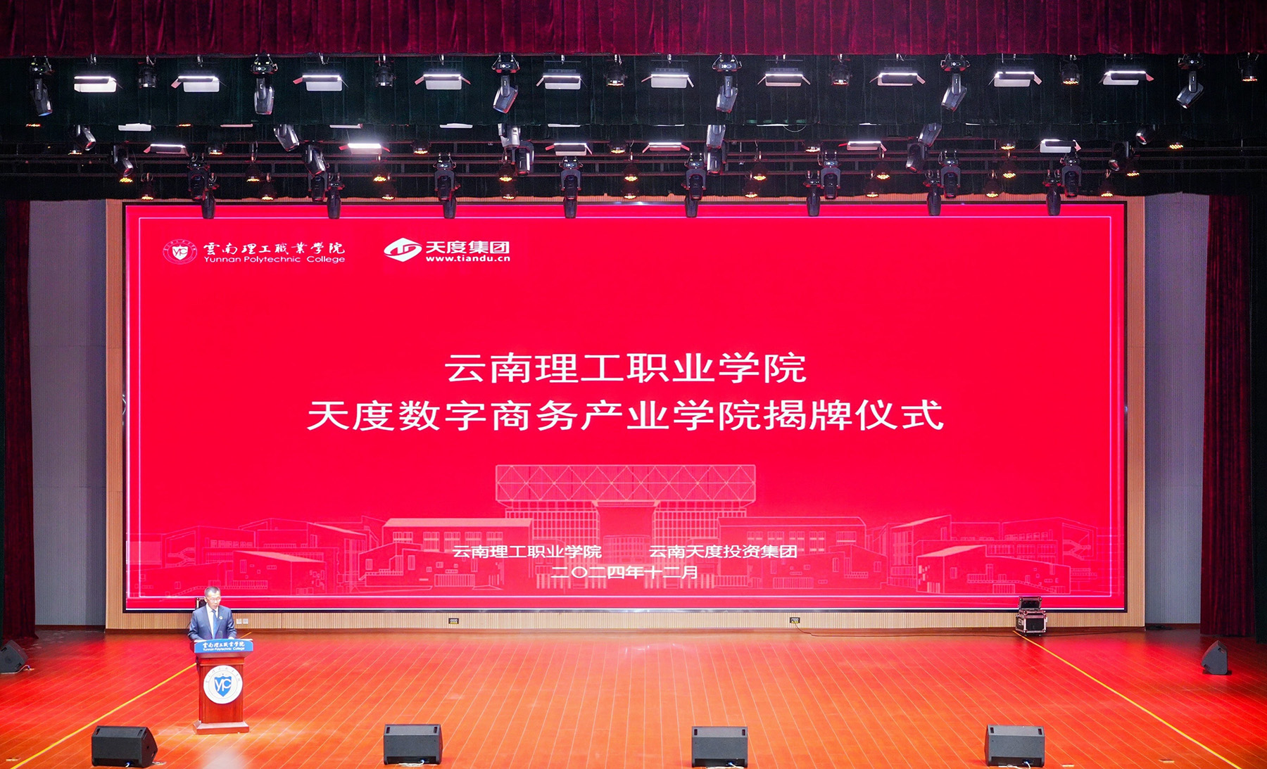 12月5日,云南理工職業(yè)學(xué)院天度數(shù)字商務(wù)產(chǎn)業(yè)學(xué)院簽約揭牌儀式在學(xué)生會堂隆重舉行。此次簽約標志著云南理工職業(yè)學(xué)院與云南天度投資集團強強聯(lián)手,共同開啟職業(yè)教育產(chǎn)教融合新篇章。
