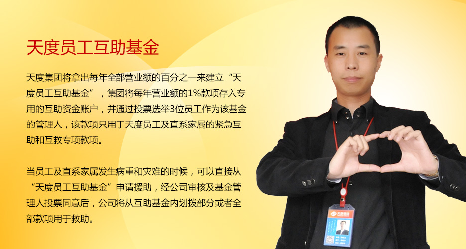 當(dāng)員工及直系家屬發(fā)生病重和災(zāi)難的時候,可以直接從“天度員工互助基金”申請援助,經(jīng)公司審核及基金管理人投票同意后,公司將從互助基金內(nèi)劃撥部分或者全部款項用于救助。