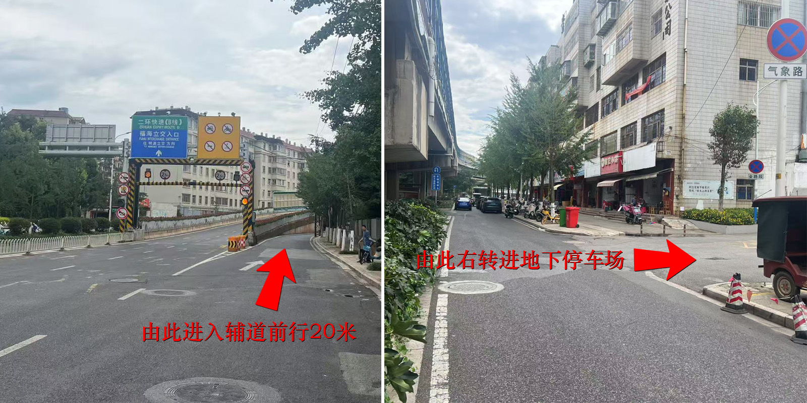 開車路線導(dǎo)航:請沿著氣象路上二環(huán)方向,按左上圖所示走輔道(不要上高架)前行20米,按右上圖所示右轉(zhuǎn)下地下停車場,進入停車場急左轉(zhuǎn)直行下一層進入負(fù)三樓,在A4棟(A座寫字樓)電梯口(天度集團專用停車位,旁邊有值班人員)停車,然后坐電梯至8樓。