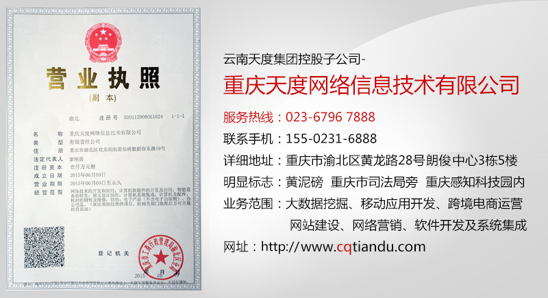 云南天度集團(tuán)控股子公司-重慶天度網(wǎng)絡(luò)信息技術(shù)有限公司于2015年6月9日在重慶市渝北區(qū)注冊(cè)成立,主要從事大數(shù)據(jù)挖掘、移動(dòng)應(yīng)用開發(fā)、跨境電商運(yùn)營(yíng)、網(wǎng)站建設(shè)、網(wǎng)絡(luò)營(yíng)銷、軟件開發(fā)及系統(tǒng)集成等業(yè)務(wù)。公司位于重慶市渝北區(qū)黃龍路28號(hào)朗俊中心3棟5樓(整層),服務(wù)熱線:023-6796 7888