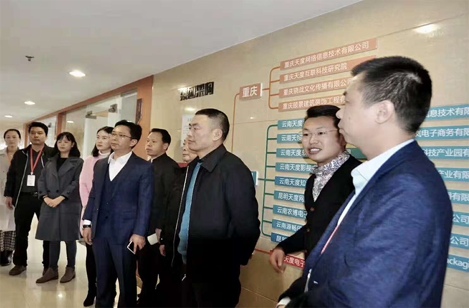 2018年10月11日,云南省重慶商會會長蒲治全、執(zhí)行會長汪國財、常務(wù)副會長高柱明、秘書長張艷婷、副秘書長蒲智勇、宣傳部王清一行蒞臨天度集團考察交流。集團公司董事長鄭桂文、黨支部書記俞友剛、昆明電子商務(wù)協(xié)會秘書長胡曉玲、商務(wù)部張曉麗、運營部臧永梅與重慶商會領(lǐng)導(dǎo)就商會合作、渝商大數(shù)據(jù)平臺建設(shè)等進行了交流和洽談。