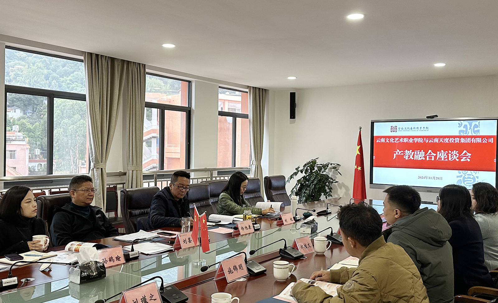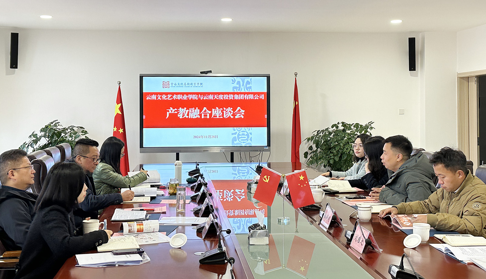 為深入貫徹省委、省政府關(guān)于推動產(chǎn)教融合的政策精神,加強學(xué)校與產(chǎn)業(yè)的深度融合發(fā)展,打造校企協(xié)同職業(yè)教育發(fā)展新模式,11月28日上午,云南文化藝術(shù)職業(yè)學(xué)院與云南天度投資集團(tuán)有限公司召開產(chǎn)教融合座談會。云南文化藝術(shù)職業(yè)學(xué)院黨委書記劉鑒允,黨委副書記、院長楊旭康,黨委委員、副院長孫鶴瑜,黨委委員、副院長劉悅;云南天度投資集團(tuán)有限公司董事長鄭桂文、副總經(jīng)理陳玉鳳、副總經(jīng)理施錦明,云南天度科技發(fā)展有限公司總經(jīng)理胡婷婷及相關(guān)負(fù)責(zé)人參加座談交流。