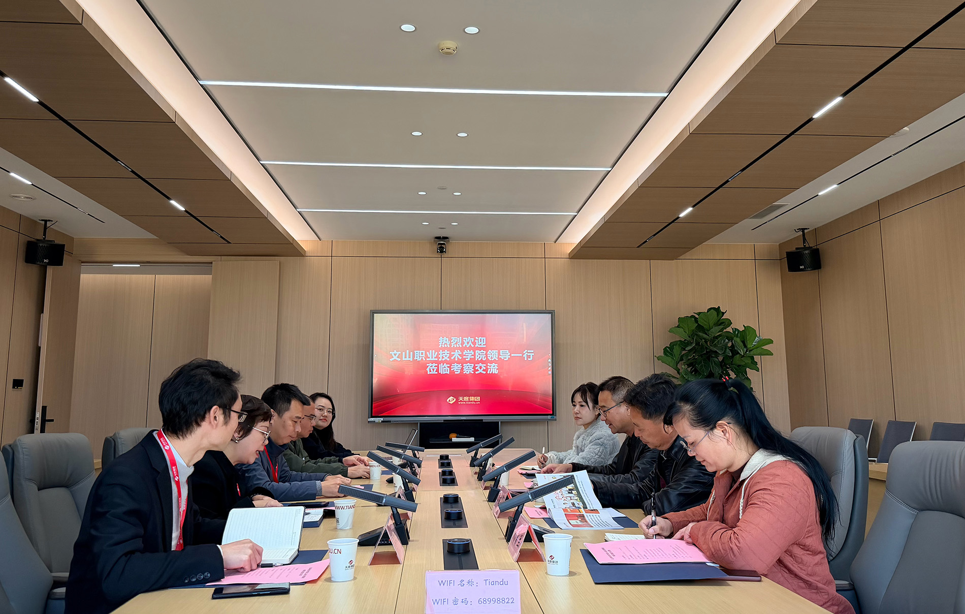 天度集團(tuán)結(jié)合自身在智能制造、人工智能應(yīng)用、數(shù)字化運(yùn)營等領(lǐng)域的發(fā)展實(shí)踐,分析了相關(guān)行業(yè)對技術(shù)技能人才的能力要求,并介紹了集團(tuán)在產(chǎn)教融合方面的現(xiàn)有模式與案例。儂援校長對天度集團(tuán)二十年取得的成就表示贊賞,并介紹了文山職業(yè)技術(shù)學(xué)院在專業(yè)建設(shè)、人才培養(yǎng)方面的特色與規(guī)劃。他表示,此次參訪旨在深化學(xué)校與省內(nèi)優(yōu)質(zhì)企業(yè)的聯(lián)系,推動教育鏈、人才鏈與產(chǎn)業(yè)鏈、創(chuàng)新鏈的有機(jī)銜接。